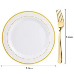 72 Pcs Gold Dessert Plates 7.5″ With 72 Pcs Gold Plastic Forks 7.4″, Heavyweight White With Gold Rim Plastic Plates, Gold Salad Plates For Party And Gold Appetizer Plates For Wedding