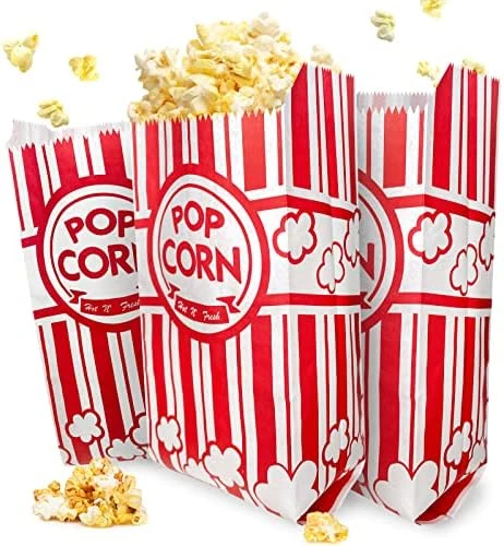- Classic and Simple Design – Movie theater paper popcorn bags mainly use the red and white color scheme, with the striped design, looks very simple and generous, so it is a good choice to use these bags to fill the popcorne color scheme