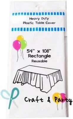 - Plastic Table Cover. Color: White. Rectangle 54″ X 108″. 12 pack.