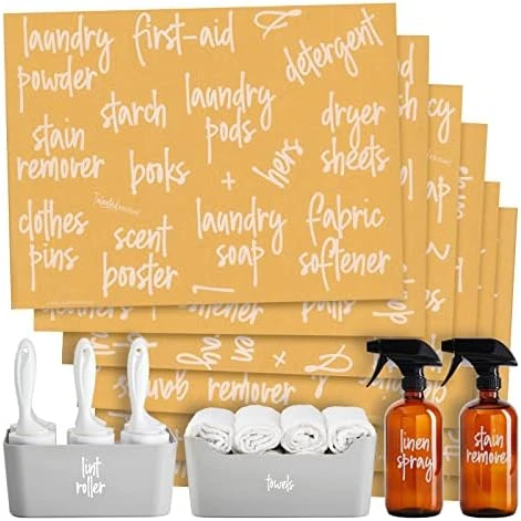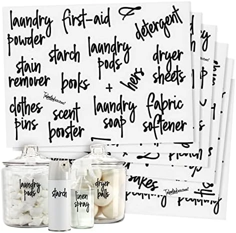 - Picture Perfect Organization: Use the household labels organization preprinted for laundry soap, cleaning supplies, canisters, dispensers, and storage bins; the laundry stickers for jars feature names of everyday household items such as soap, bleach, spray cleaners, towels, starch, stain remover, books, and clothespins