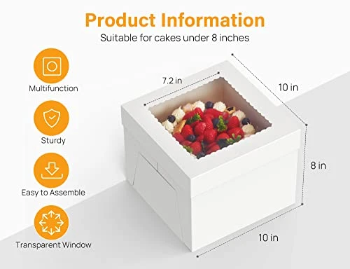 - 10″ Cake Box: The cake box is square and measures 10x10x8 inches. It is suitable for the placement of cakes within 8 inches, and a height of 8 inches can meet the placement of taller cakes.