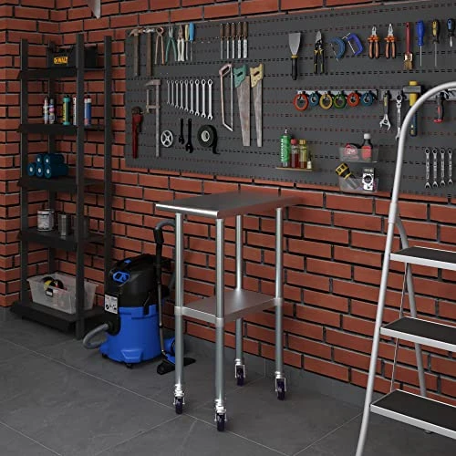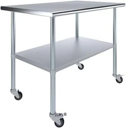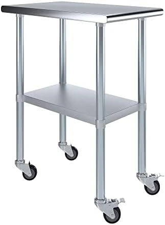- This mobile stainless work table has a weight capacity of 380 lbs, evenly distributed. The bottom shelf has a capacity of 280 lbs, evenly distributed