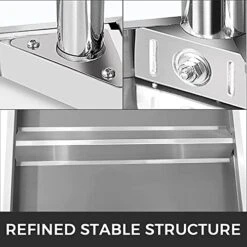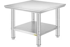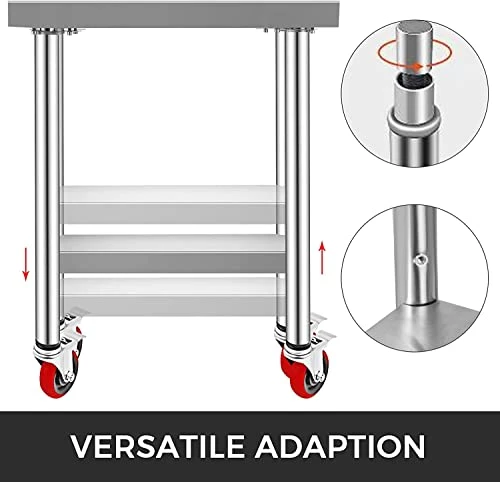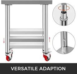 - Adjustable Undershelf: Since the stainless steel work table’s lower shelf is flexible, you can raise or lower it to accommodate the size of the items you need to store. The shelf sets have 3 levels of height (the distances between 2 shelves: 15.4-18.5-21.7 in) to fit your needs. The larger storage space is favorable for you to organize your frequently used cooking items well.