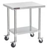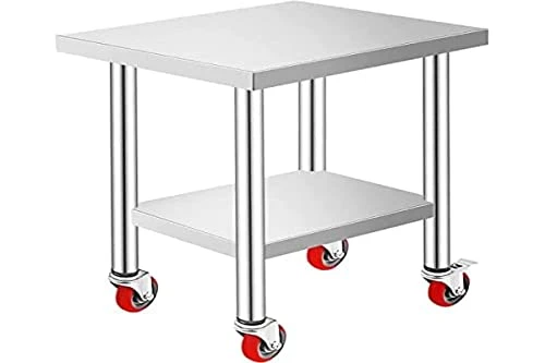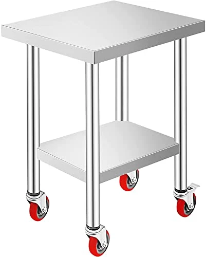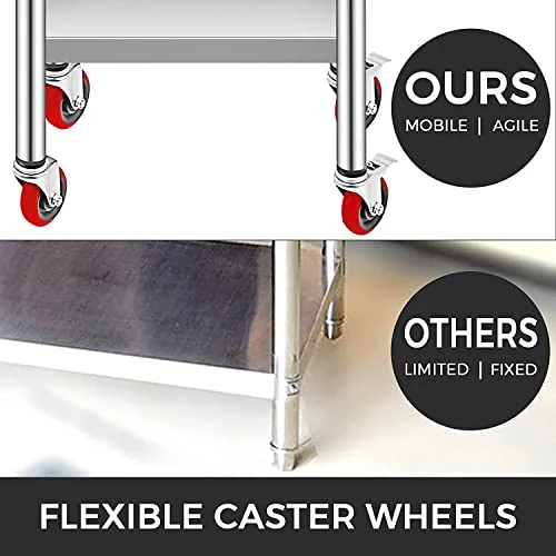 - Convenient Movement: This stainless steel table has four 360 degrees rotating wheels, making turning the equipment possible. It is made of non-marking polyurethane rubber; these caster wheels are very quiet and smooth while rolling. In addition, two wheels have brakes, ensuring the table remains still at any time.