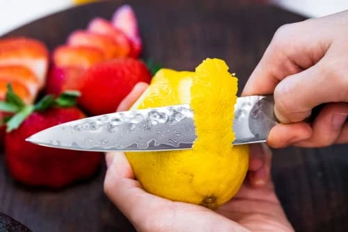 - HAMMERED FINISH makes the food stick less to your blade. Our Knives are tested up to FDA standers, and free of heavy metals.