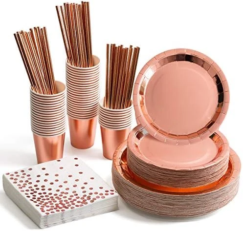 - EASY TO USE: Plastic flatware set is heavy-duty, can be cleaned and stored for next time use. Plates, Cups and Napkins are made of 100% paper. Party plates and disposable cups are designed to not fold or tear and strong enough to hold a full plate of food