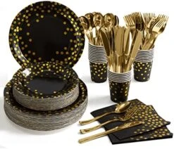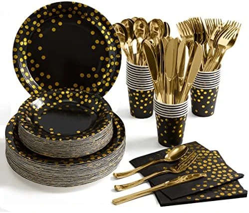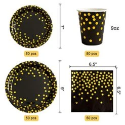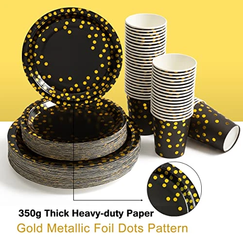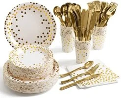 - FANCY ELEGANT DESIGN: This party supplies pack is designed to white background and gold metallic dots. The white paper plates and cups are all enhanced with attractive gold foil dots. Adding an elegant, fancy touch to your party. Perfect choice for a gold or white and gold themed party