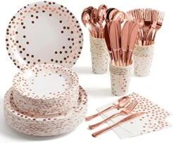 - CONVENIENT and EASY CLEAN-UP: Save clean up time by throwing the paper plates cups napkins and plastic silverware out after use, while still enjoying the decorative and elegant accent they add to your event. Please don’t microwave the plates and cups