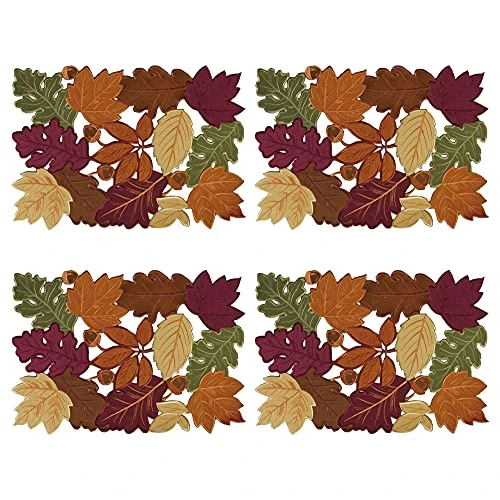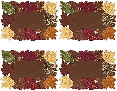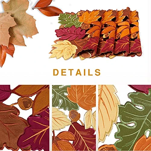 - [GOOD QUALITY]–These table place mats are made of 100% polyester fabric. Made by our Oeko-Tex certified factory. Most of the maple leaves are appliqué, with allover embroidery and cutwork, subtle and not too flashy. Good quality giving a long lasting use. Could be used for all the autumn season.