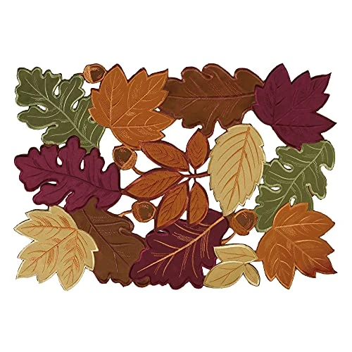 - [FEATURE]–These table placemats combinated fall colors with unique Sateen maple leaves with embroidery and hand cutwork, makes this place mat elegant and high-quality. Intricate cutouts along the edges are the perfect finishing touch. Classic colors in green, yellow, brown, rust and burgundy are not easy to fade, easy to match your autumn table decoration, add a thanksgiving atmosphere to your home.