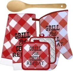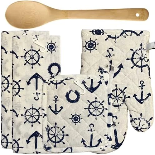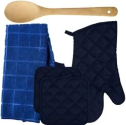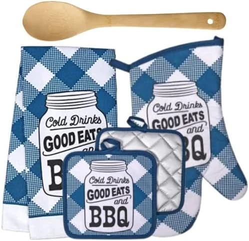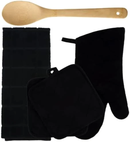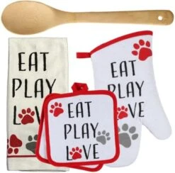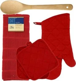 - MEASURMENTS – Kitchen towels 25×15-in., oven mitts 13×7-in., pot holders 7×7-in., bamboo spoon 12×2.25 in.