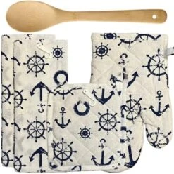 - OVEN MITTS – Front 100% cotton, back 100% polyester, Pot Holders: front 100% cotton, back 100% polyester, Spoon 100% bamboo. Linens can be machine washed. Hand wash wood spoon.