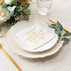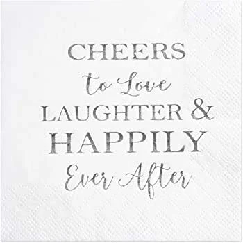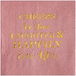 - White napkin with Gold foil stamped text: cheers to love laughter & happily ever after.