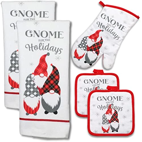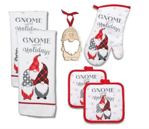 - 5pc Gnome for the Holidays Mitten Set: Each set include kitchen towels, and 2-ct. packs of potholders and one gnome ornament, each gnome themed. Ideal in home kitchens, restaurants, rental properties, and more.These holiday themed kitchen linens are a stylish addition to any kitchen. Perfect for restaurants, cafeterias, home kitchens, and more. Also great for housewarming parties or holiday gift giving!