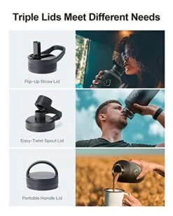 - 3 Caps Pack, 100% Leak-Proof: BUZIO stainless steel water bottle comes with 3 lids: portable handle lid, easy-twist spout lid, and flip-up straw lid to meet camping, hiking, cycling, fitness sports and more. Each lid has a thickened 360° seal for 100% leak-proof.