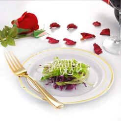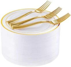 - IDEAL FOR CELEBRATIONS: Disposable salad plates and gold forks with beautiful color and design are great for birthday party, wedding reception, serving appetizers, salads and desserts and special events.