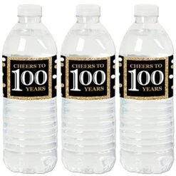 - UNIQUE BEVERAGE BAR: Adult 100th Birthday – Gold Water Bottle Labels will make coordinated beverage area at your birthday party. Add Adult 100th Birthday – Gold Water Bottle Labels to standard water bottles, mini water bottles, soda bottles and single-serving juice containers. Water bottle labels can also be used on cylinder containers to create Adult 100th Birthday – Gold centerpieces.