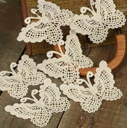 - These off-white butterfly-shaped doilies are detailed in design, perfect under floral arrangements and candles.