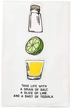- Features frayed edge flour sack appliqué depicting a margarita glass filled with margarita, ice, and a lime garnish.
