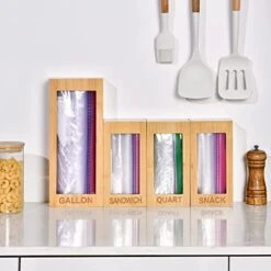 - Considerate Design: Plastic bag organizer, ziplock bag organizer for drawer, the natural wood grain finishing touches create a modern aesthetic that will make your kitchen cabinets and drawers look more well-ordered, pantry organization and storage. Drawer organizer, Looks so nice and tidy in a drawer, Pleasing to the eye. Drawer organizer kitchen utensils. Bag storage organizer for kitchen drawer.