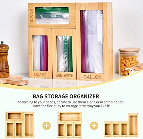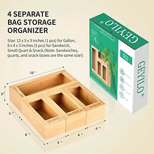 - Easy to Clean: Bamboo ziplock bag storage organizer, simply wipe clean with damp cloth. Please to keep ventilated and dry. A perfect bamboo drawer organizer set decorates a healthy home life! Please Note: Don not put in dishwasher or soak it in water. (Note: Sandwiches, quarts, and snack boxes are the same size!)