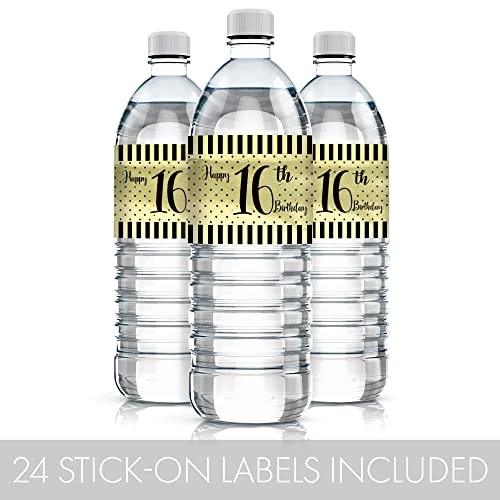 - Add a LITTLE SOMETHING EXTRA to a 16th birthday party for him or her with these black and gold 16th birthday water bottle stickers.