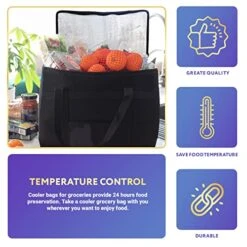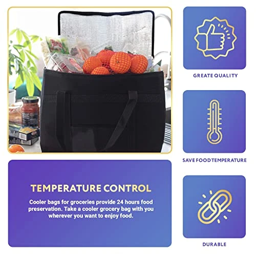 - TEMPERATURE CONTROL: Cooler bags for groceries provide 24 hours food preservation. Take a cooler grocery bag with you wherever you want to enjoy food. With delivery bags for hot food, hot food stays hot, and cold stays cold. Food bags for delivery won’t let you and your food down.