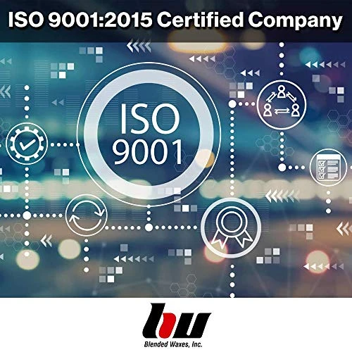 - Quality and product clarification: A variety of standards and certifications are met to ensure the wax blends meet the highest specifications. Blended Waxes product testing is done to the requirements set forth by the American Society of Testing and Materials. Blended Waxes, Inc. manufacturing processes are certified by the International Organization for Standardization ISO 9001-2015. You can count on top-quality in every batch.