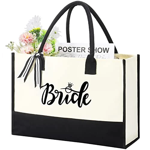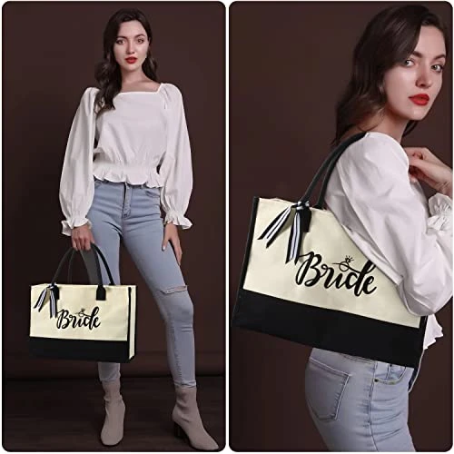 - Large Capacity and Durability: Our bridal shower gift for bride is made of heavy duty 100% 12oz. natural canvas and measures 16.9 x 7.8 x 11.8 inches, which can easily hold everyday accessories. This bridal gift bag has a wrap-around core treatment at the handle, so it feels comfortable whether it is used for hand-carrying or slung over the shoulder. Compared to other printed models, the embroidered model has neatly done stitching, making canvas tote strong enough and look more premium.