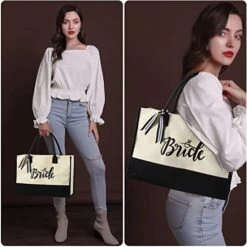 Be the first to review “Bride Tote Bag Bridal Shower Gift Embroidered Canvas Personalized Bridal Bag Engagment Wedding Honeymoon Gifts For Bride At Bachelorette Party Gift For Friend Trip Handbag With Internal Zipper Pocket” Cancel reply