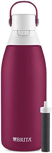 - This 32 oz Brita water bottle is made from durable, double-wall insulated stainless steel to keep water cold and features a leak-proof lid; Height 10.6″; Diameter 3.8″; Weight 1.1 pound