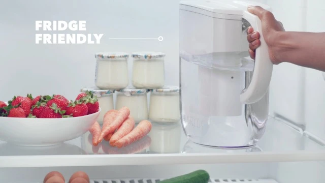 - This space efficient Brita pitcher fits perfectly on refrigerator shelves, features an easy-fill locking lid and is easy to pour; Height 10.47″; Width 5.59″; Length/Depth 10.94″; Weight 2.29 pounds