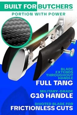 - With heft, materials and quality feel. Imported black G10-Garolite military grade handle is triple-riveted with a grip that ensures comfort and maneuverability. Laminated and polished for a sanitary build, perfect for busy kitchens