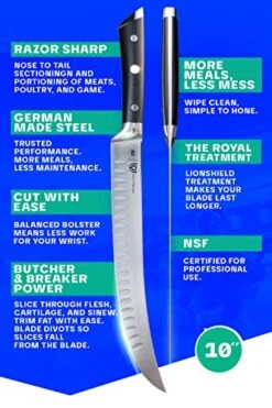 - This knife is expertly crafted and designed to masterfully slice through flesh, break through cartilage and trim fat from beef, pork, poultry, fish and other meats. Engineered to perfection at 56+ Rockwell hardness and hand polished to a satin finish. Carefully tapered for improved hardness, flexibility, and minimal slicing resistance. Tall blade height provides useful knuckle clearance. National Sanitation Foundation (NSF) certified