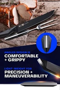 - Midnight black ergonomic, fiber-resin and military grade G10 handle is nearly impervious to heat, cold and moisture. The handle geometry tucks snugly into the palm for a firm grasp. Full tang blade, offset handle for knuckle clearance.