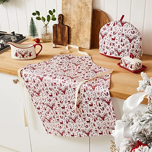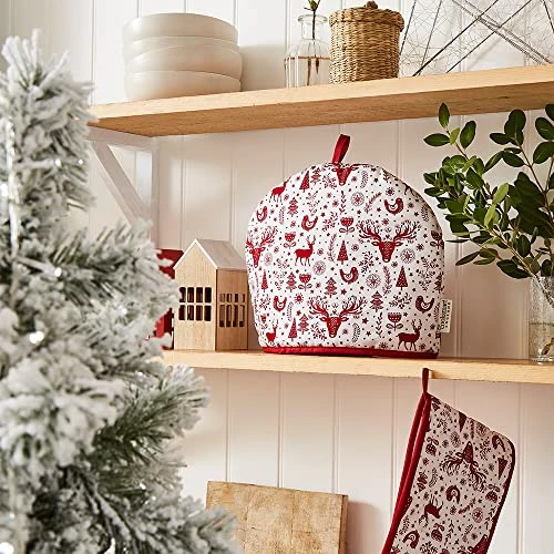 Keep your tea warm with this joyful Nordic Christmas tea cosy from Cooksmart. Featuring reindeers, robins & cute trees, it will look wonderful in your kitchen over the festive period. Made from good quality cotton with a convenient hanging loop. This cosy will fit up to a six cup teapot. Matching items are available! Specifications: Material: 100% cotton with a polyester lining for insulation Dimensions: W 32.5cm x H 28.5cm Approx. Cleaning: Machine Washable