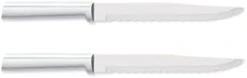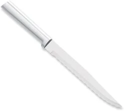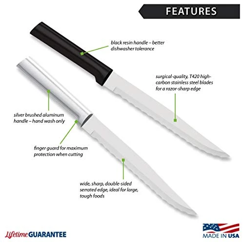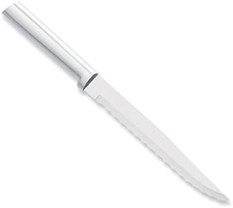 - BRUSHED ALUMINUM HANDLE – The handle on the serrated slicing knife is made from permanently cast silver brushed aluminum with a satin finish. Β This kitchen knife should not be washed in the dishwasher. Β Handwashing is recommended.
