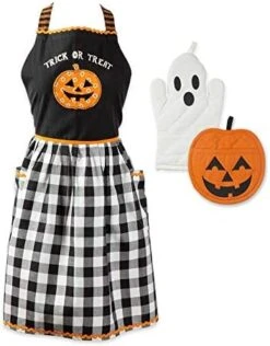 - HOST A HALLOWEEN PARTY: Get ready to party with this fun apron and oven mitt set and that your guests will enjoy. Wear over a costume or not but this will get everyone in the spirit of the holiday.