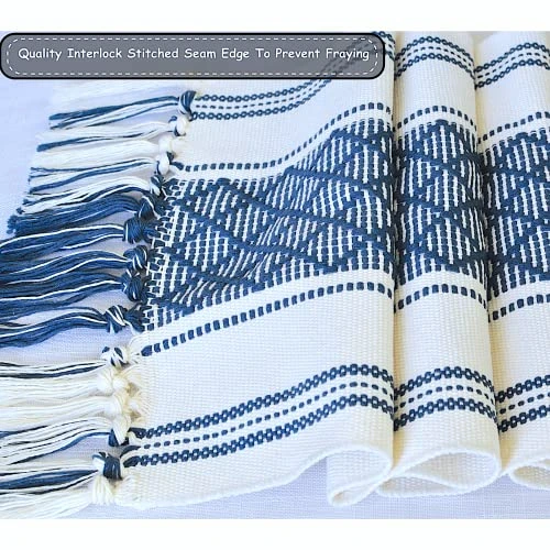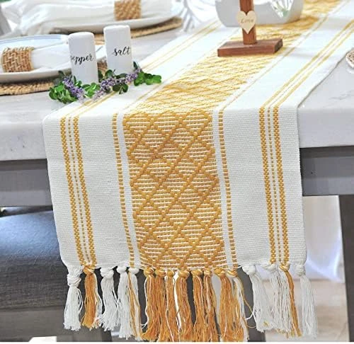 - ✅ Superior Quality Thick, Non-Slip, Woven & Shrink Resistant Washable Fabric : Our Bohemian Table Runner is made up of thick cotton and polyester blend threads making it shrink proof after washing, very durable, wear and tear resistant runner. The heavy fabric has jaw-dropping geometric stripes and diamond pattern woven design with pure cotton threads and hand knotted tassels at both ends. Material: 45% Cotton, 45% Polyester, 10% Viscose.