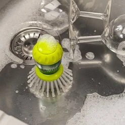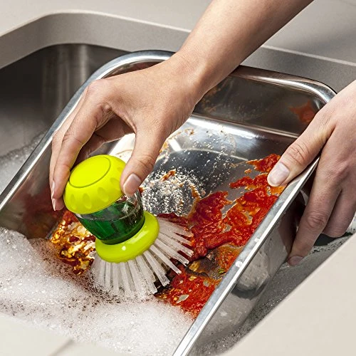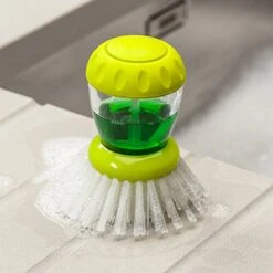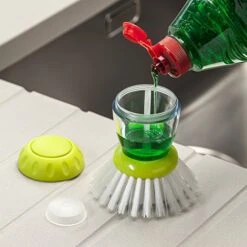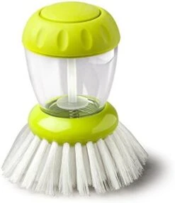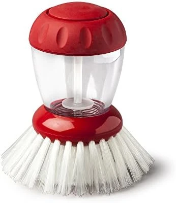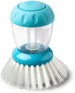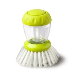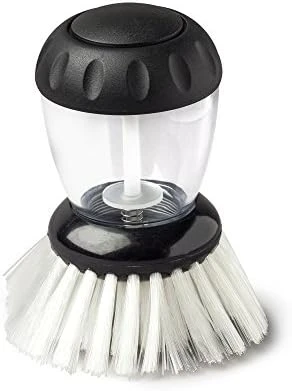 - Durable nylon bristles get into edges of pans. It has an easy to unscrew cap for quick refills. Ergonomic non-slip grip fits perfectly in the hand.