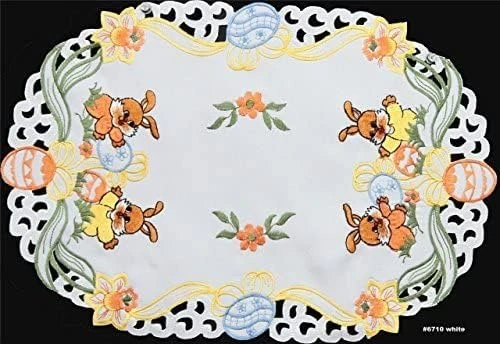 - White quality material with embroidered cute bunnies, Easter eggs, colorful flowers & green leaves …