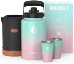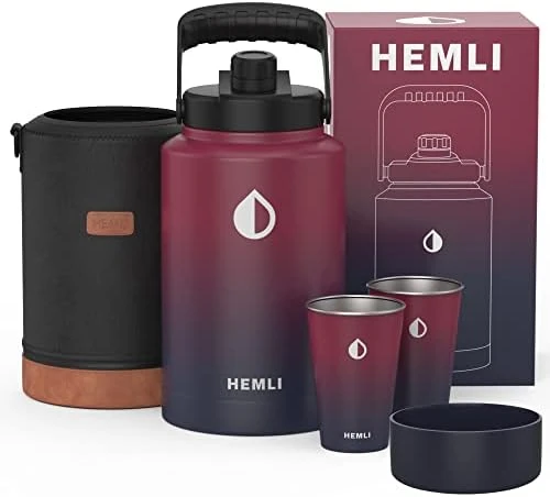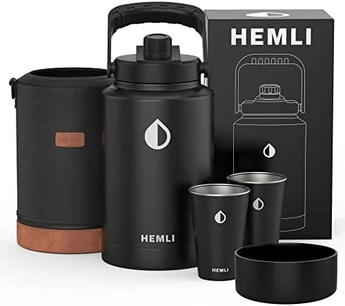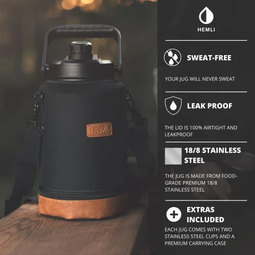 - Each 128 oz insulated water bottle comes with a durable carrying case with faux leather accents. The carrying case has an attached handle loop to assist drinking and a sturdy shoulder strap to help carry the large metal water bottle. Each gallon thermos also comes with two 16 oz. stainless steel cups which are perfect for sharing with friends. We are so confident you’ll love this water bottle each 1-gallon water jug comes with a lifetime warranty against manufacturer defects. Hand Wash only.