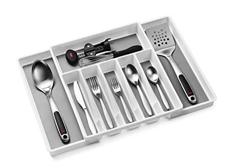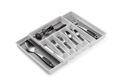 - Expandable & Adjustable. Expands from 13″ to 23.75″ wide – fits easily in most kitchen drawers, adjust to the width of your drawer for instant custom fit