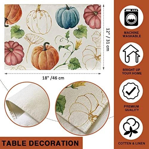 - Standard Size: Comes with 4 pieces of rectangular table mats. Tabletop place mats size: 12″ x 18″ unfolded. Hemmed and reinforced edges can help to keep placemats from fraying. Seasonal place mats suitable for spring, summer, autumn and winter