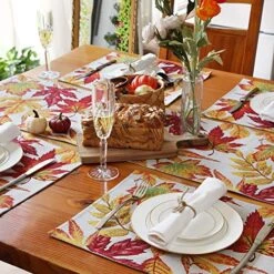 - 🍁Durable Material: This autumn table runner is made of 35% cotton and 65% polyester. Its premium fabric protects your tabletop from heat. Wrinkle free and no fading. Search “B08BXK6LL2” on Amazon to find matching placemats.