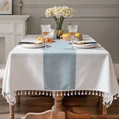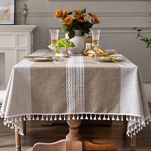 - DURABLE MATERIAL – Manufactured from super, hard wearing 100% heavy cotton linen fabric, with a seamless construction that won’t easily fray after long term use; Linen tablecloth, tassel length included, totally measures 60″ in Diameter; Fits a table that measures 20 – 45 inches in diameter