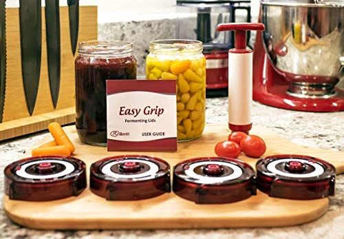 - COMFORTABLE EASY GRIP TABS; no more sore hands as we carefully designed our lids with 4 ergonomically designed tabs which allow easy opening when your fermented vegetable is done; you will enjoy the comfortable rounded upper edges on the entire lid which make this the most comfortable to use mason jar fermentation lid
