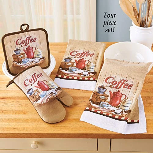 - The set includes an oven mitt, pot holder and two hand towels