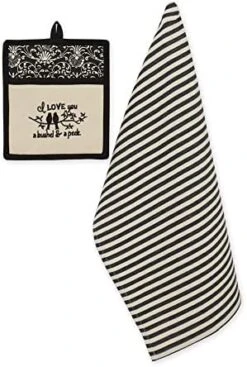 - DECORATIVE AND DURABLE: 100% Cotton set includes 1 decorative potholder 9×8″ and 1 striped dishtowel, 18×28″; Potholder is heat resistant to protect your hands while handling hot pots, pans, dishes, casserole dishes and more