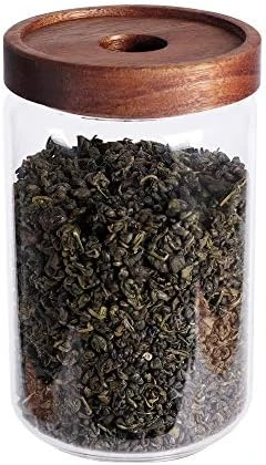- [Convenient & Attractive ] 5 piece kitchen canister set in clear glass to find your kitchen goods quick and easy. The wooden lid and translucent glass offer minimalist and modern design that blends in perfectly with your appliances and kitchen decor.